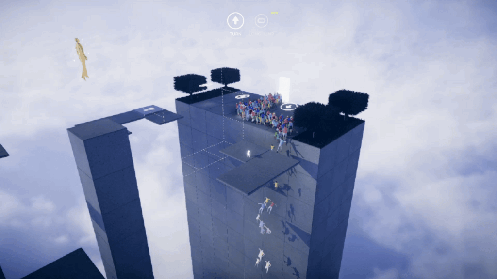 One of Humanity’s biggest strengths is its calming, almost meditative mood. The music blends ambient tones with mysterious melodies, making it easy to zone in. Watching the faceless human crowd respond to your commands, pour down ramps, or leap across platforms can be oddly hypnotic — even when they’re marching straight off a ledge due to a misstep on your part.